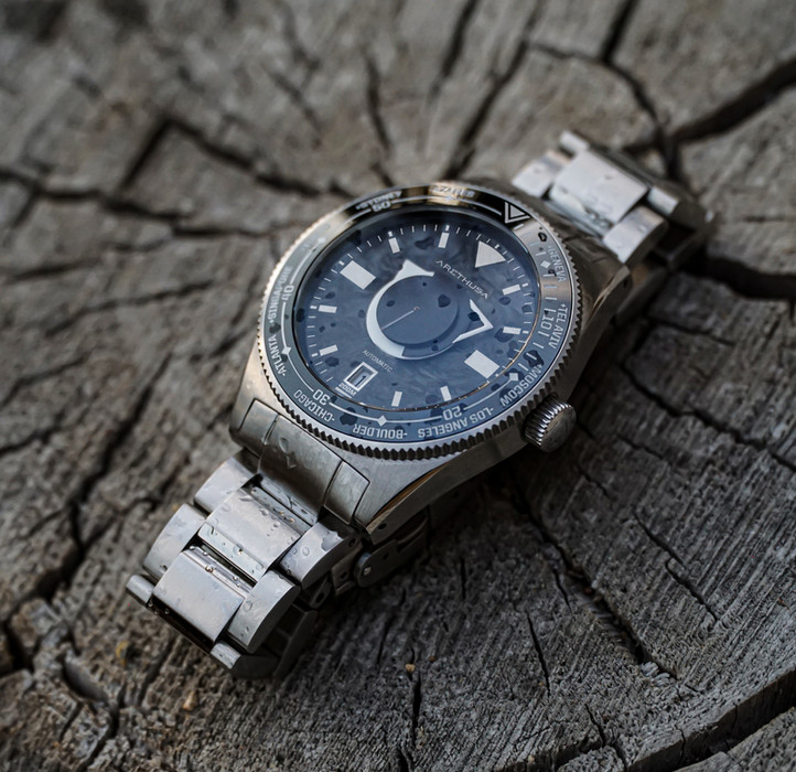 From the summit of Colorado's Rocky Mountains to the depths of the Pacific, the World Diver has been designed and tested for the modern explorer. Rugged durability stems from a 316L surgical stainless steel case and sapphire crystal, establishing robust protection for the Seiko NH35A movement within and water resistance to 200m. Additionally, the dual dive and "World Time" tracks of the ceramic bezel are filled with BGW9 Super-LumiNova® for red eye flights and expeditions after sundown.